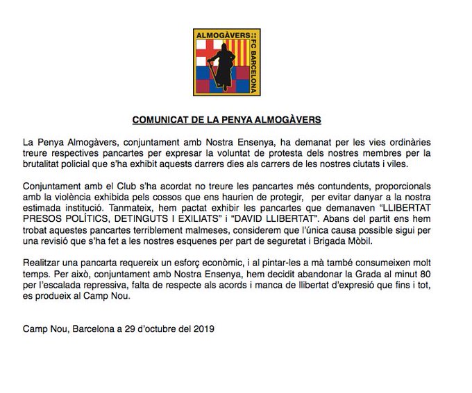 - "Pactamos exhibir las pancartas que pedían 'libertat presos polítics, detinguts i exiliats' y 'David llibertat', pero antes del partido nos las hemos encontrado dañadas. Consideramos que la única posibilidad es una revisión a nuestras espaldas de seguridad y la Brigada Móvil. Por este motivo, junto con Nostra Ensenya, hemos decidido abandonar la Grada en el minuto 80 por la escalada represiva, la falta de respeto a los acuerdos y la falta de libertad de expresión", concluía la Penya Almogàvers. Cedía pero, aún así, se vio perjudicada por la Seguridad del Estadi.